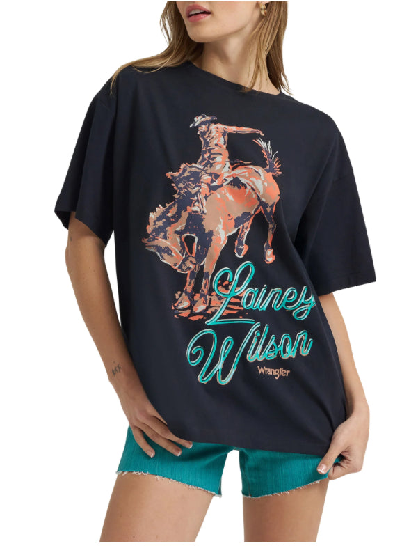 Celebrate country music's boldest spirit with this Wrangler Lainey Wilson Bronc Rider Tshirt. Featuring iconic bucking bronco imagery and an eye-catching saying on the back, this tee captures the fearless energy of one of country's most electrifying performers. Crafted for comfort and durability, it's the perfect choice for fans who live by the rodeo lifestyle and appreciate authentic Western style. Wear it to shows, around town, or anywhere you want to make a statement.