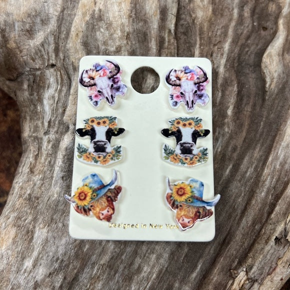 Set of 3 Post Earrings Acrylic Cows and Steers