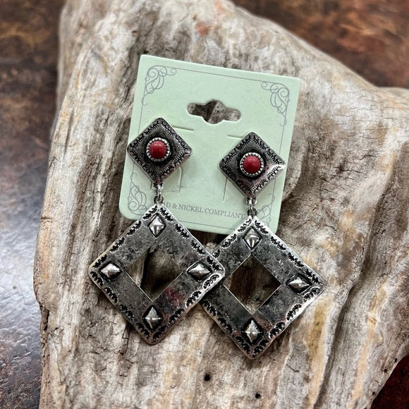 Silver Diamond Western Dangle Earrings Red