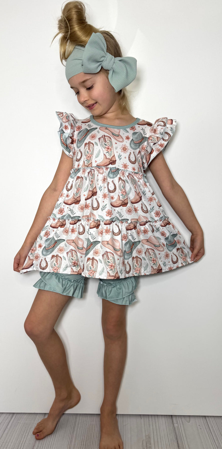 Introduce your young rider to classic Western style with this charming Sage Cowgirl Girls Set. Perfect for ranch days, rodeos, or imaginative play, this coordinated ensemble features soft, earthy sage tones that complement any complexion. The set combines comfort with authentic cowgirl flair, making it ideal for girls who love horses and outdoor adventures. Quality construction ensures durability through countless wears, while the timeless design keeps her looking adorable season after season.