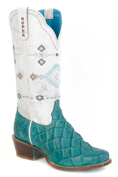 These Women’s Roper Turquoise/White Fish Print Boots combine distinctive southwestern style with practical comfort. Featuring a vibrant turquoise base accented by a detailed fish print, the boots are topped with a crisp white Aztec pattern for a unique, eye-catching look. Designed for durability and everyday wear, they provide reliable support while bringing a touch of bold artistry to your footwear collection. Perfect for those who appreciate both tradition and individuality in their western boots.